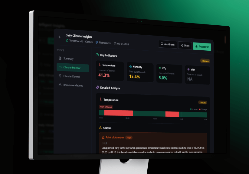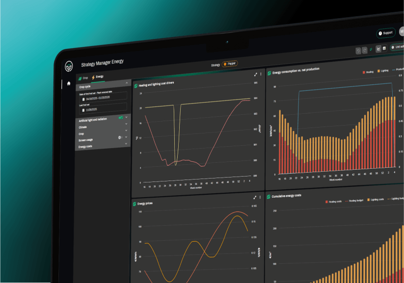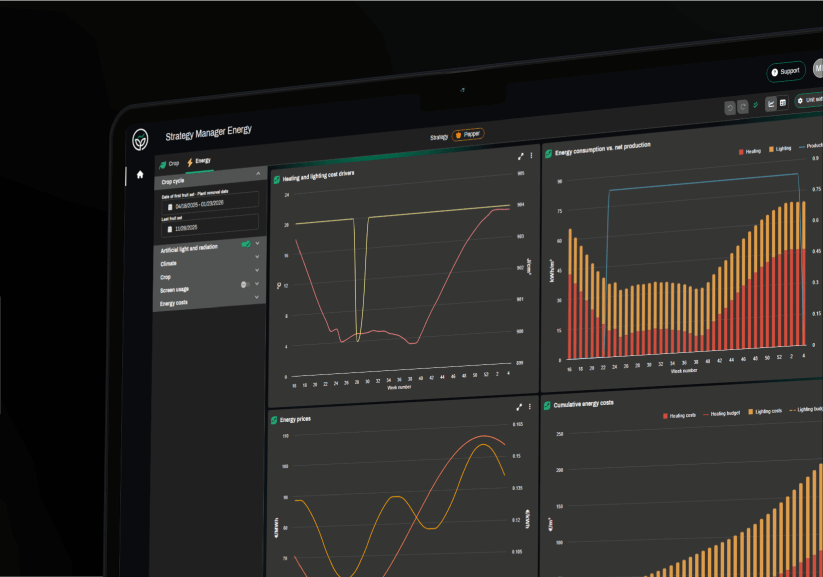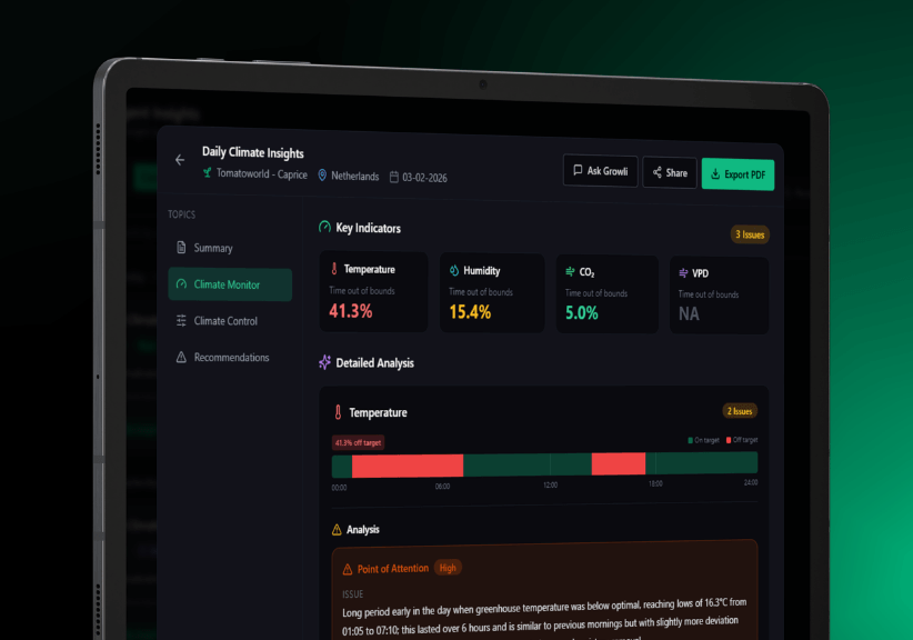 LetsGrow.com provides valuable insights into greenhouse processes through smart analytics and expert advice. Our solutions help you leverage data to achieve your goals, such as increasing yield or improving efficiency. Explore our solution packages or boost your knowledge through our training programs.
